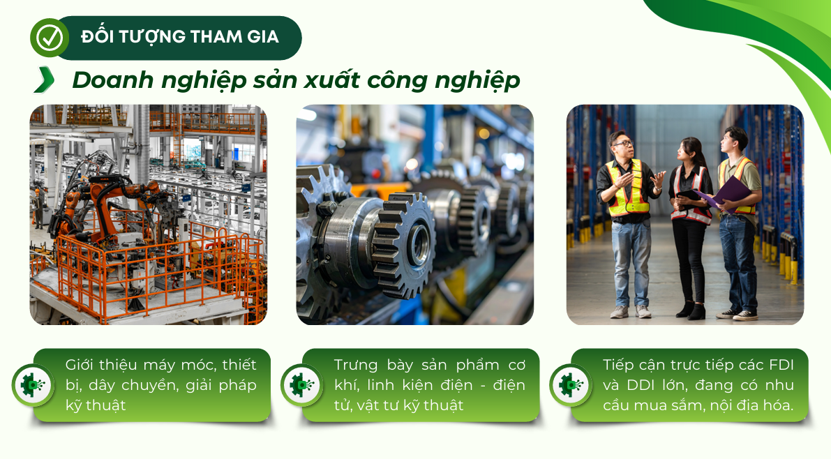 - Tiếp cận trực tiếp các doanh nghiệp FDI và DDI quy mô lớn đang có nhu cầu mua sắm, nội địa hóa và tìm kiếm đối tác sản xuất tại Việt Nam.